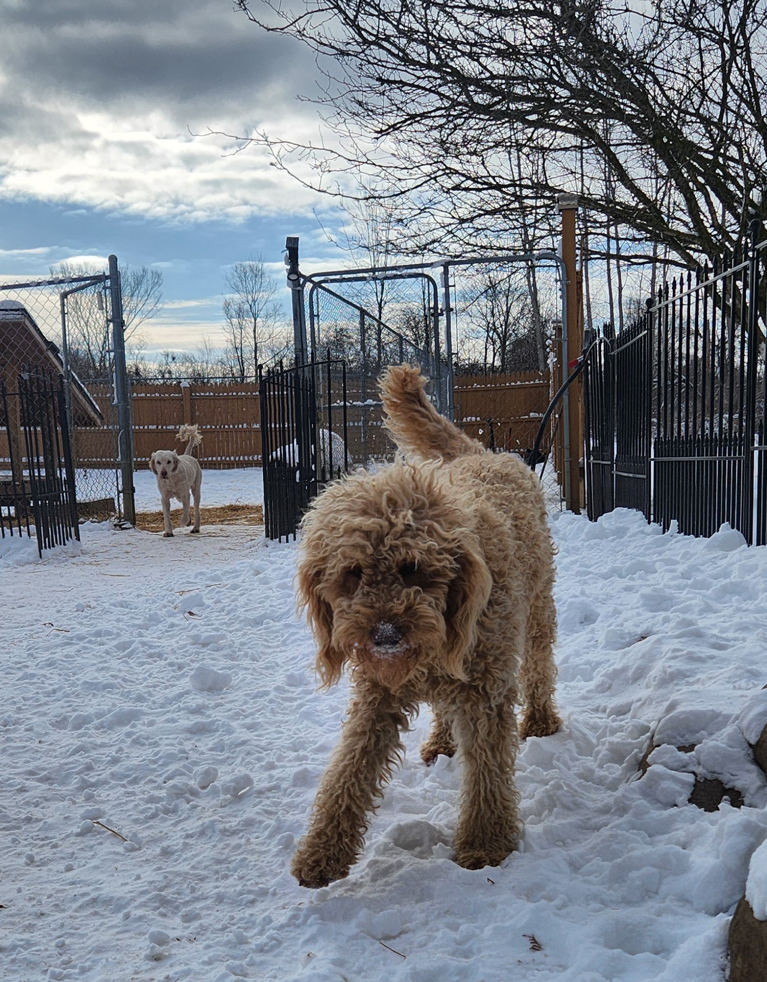 Daphne is a standard multi generation Labradoodle with both American and Australian lines. She is Veronica's litter mate sister. Their parents are Sawyer and Stella. Daphne is built more like small lab, she is shorter and a little stockier than her sister. She is a dark blond with a wavy shaggy coat, and she is non shedding. She was born in Aug. 2021, and we are hoping her first litter will be in the spring of 2024.